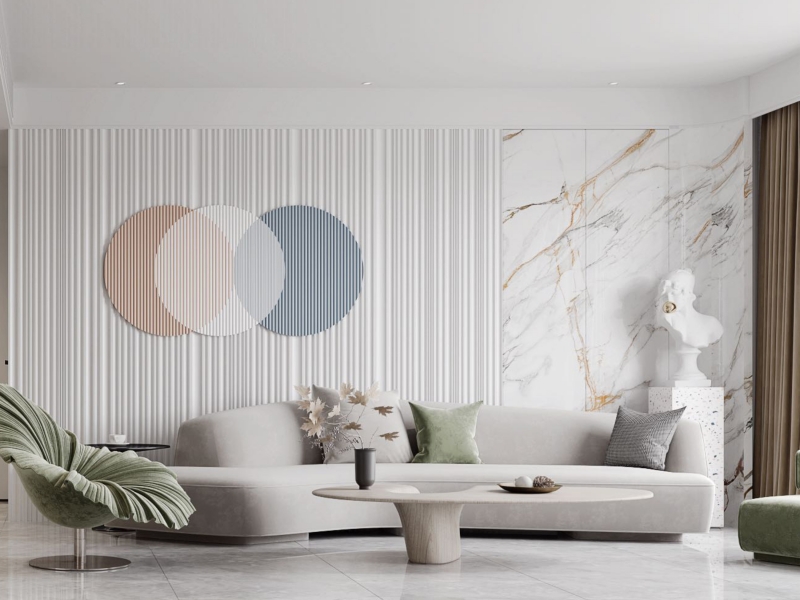客厅以白色和浅米色为主色调,搭配大理石与彩色圆形装饰,时尚又温馨。弧形沙发与绿植相衬,营造舒适放松的氛围,适合家人休闲交流,彰显简约而不失个性的品味。