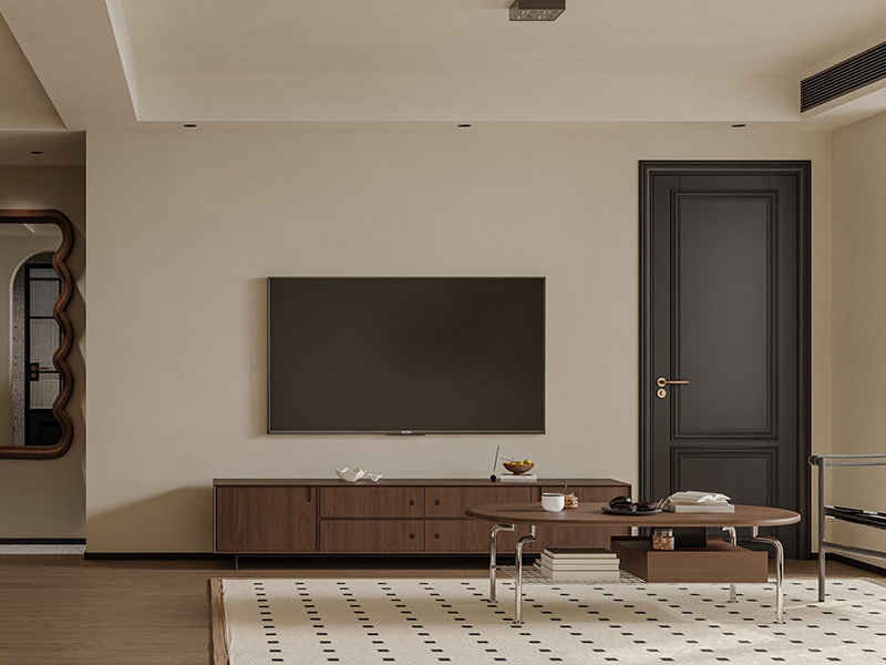 简洁的纯色墙面搭配原木电视柜,简洁实用强调复古韵味,异形茶几、几何地毯勾勒层次,增进现代感。