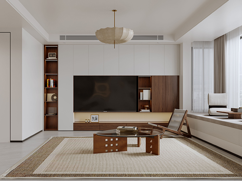 电视背景墙采用整面收纳柜设计,不同材质搭配与开放格设计进行搭配,营造出层次感,营造整洁有序的松弛氛围。