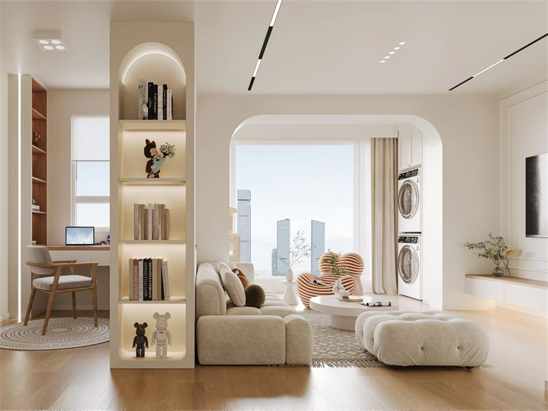 弧形书架划分空间,开放布局串联办公与会客区域,落地窗将自然光线引入室内,视觉通透分区清晰。