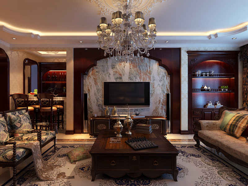 客厅以大理石电视墙 + 深色柜体,打造欧式沉稳气场。水晶灯洒落柔光,棋盘、摆件点缀生活趣味。开放式吧台模糊边界,调酒小酌或围坐聊天,把欧式的精致与随性,揉进每一次放松时刻。