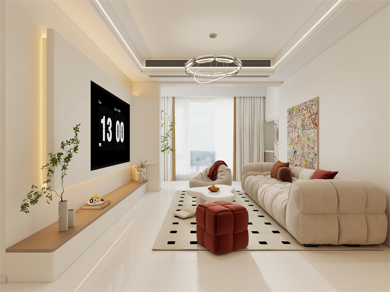 电视墙线性灯勾勒轮廓,原木层板与绿植柔化冷调,增添自然氧气感。洗烘区与客厅衔接,强化通透感;红棕元素呼应,统一视觉。大沙发搭配小凳,方便家人围坐放松,尽显简约惬意的生活方式。