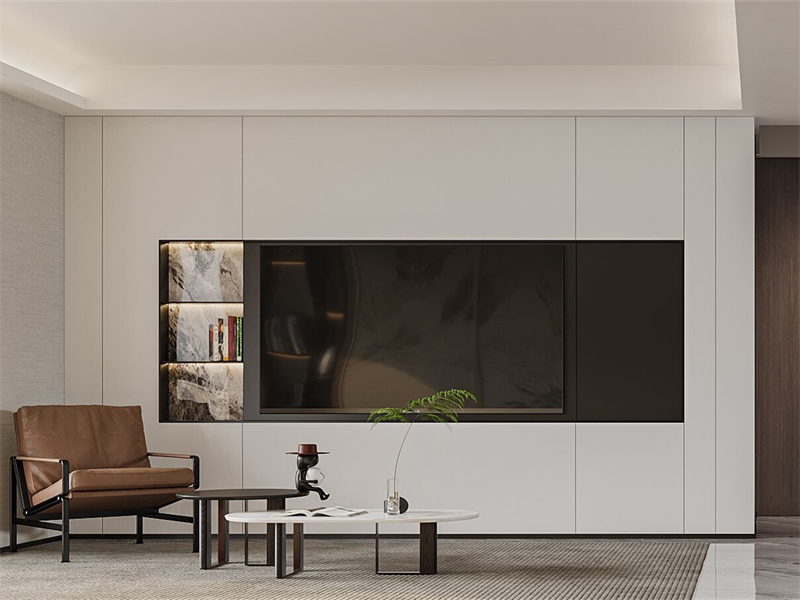 整体简洁大气,大面积白色柜体弱化电视墙厚重感,嵌入式设计让空间更规整。局部石材与开放格结合,展示装饰性物品,丰富视觉层次。皮质单椅、简约茶几搭配,营造松弛的休闲氛围。