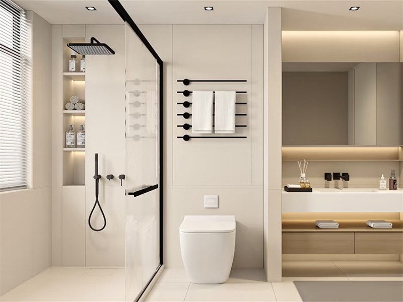 遵循极简实用逻辑,浅米色调营造洁净氛围。干湿分区明确,玻璃隔断保障通透。在有限空间里实现“整洁、便捷、精致”的卫浴体验,镜柜暗藏灯带营造氛围,诠释现代卫浴的舒适美学。