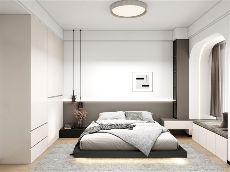 延续简约风格,借悬浮床、线性光营造静谧氛围。一体化衣柜与背景墙融合,圆弧拱门增添空间层次。黑白挂画、几何抱枕点缀,在低饱和色调中注入艺术感,构建兼具私密性与设计感的睡眠环境。