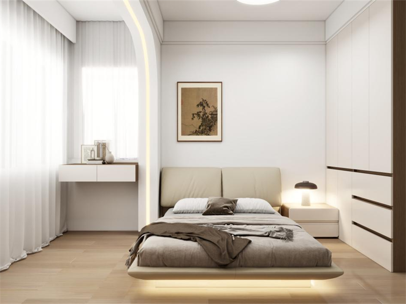 浅白墙面与原木色地板营造温润感。悬浮床搭配线性灯带,弱化边界。中式挂画、简约家具融合,飘窗书桌借自然光打造阅读角,在现代简约框架中融入东方韵味,塑造宁静治愈的休憩空间。