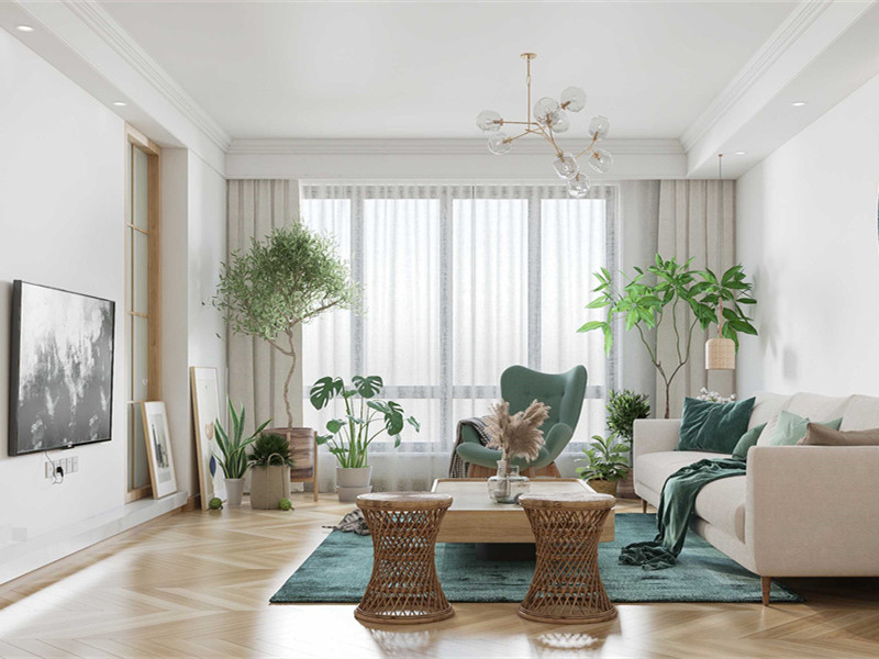 客厅把北欧 “自然哲学” 拉满,大白墙 + 原木地板,绿植如 “会呼吸的装饰”。藤编家具、玻璃球吊灯,适配午后晒太阳、晚间追剧,让家成为 “都市里的自然氧吧”,装下所有慵懒与治愈。