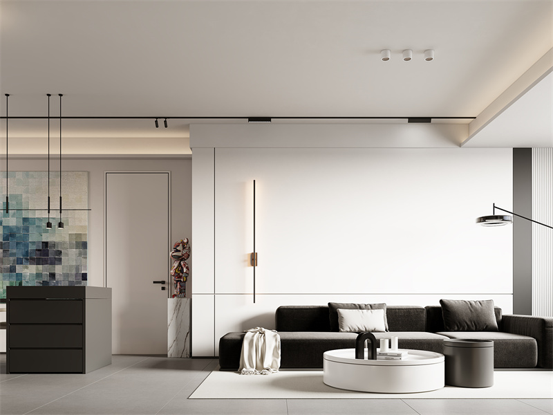 整体运用黑白灰等中性色调,营造出简洁、大气的氛围。空间布局开阔通透,线条感十足,为空间增添了利落的氛围,呈现出舒适且具格调的居住环境。