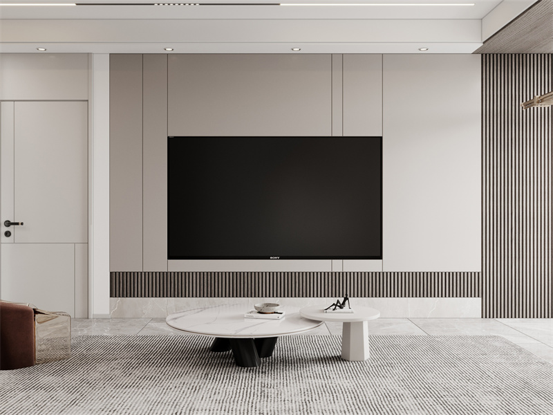 电视背景墙的简洁设计与线条元素提升层次。双圆茶几造型独特,材质对比增强视觉趣味。地面地毯柔化空间,局部金属与木质元素点缀,提升质感。