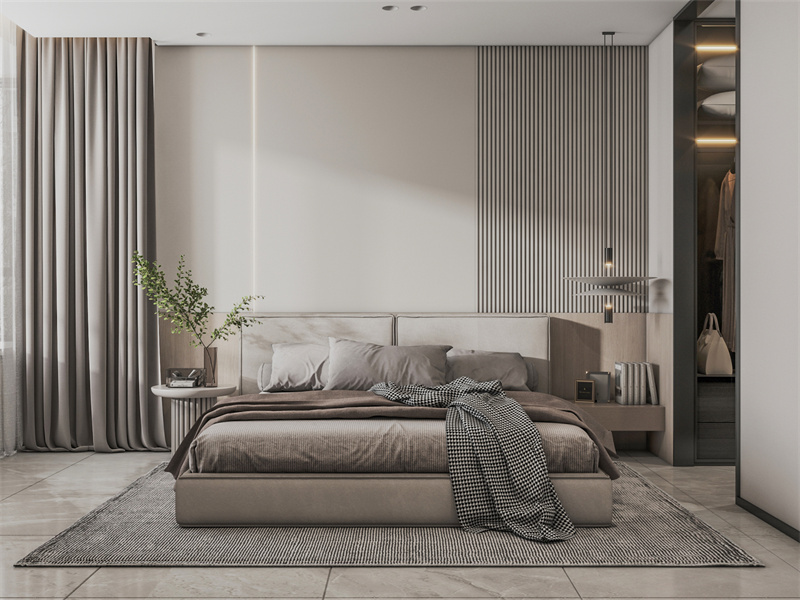以暖棕为底色,靠材质对比营造松弛氛围,床具选柔质布艺款,搭配格纹毯增加细节温度,侧边连接衣帽间提升便捷性,用灯带提升整体氛围感,营造出睡眠场景的静谧温馨感。