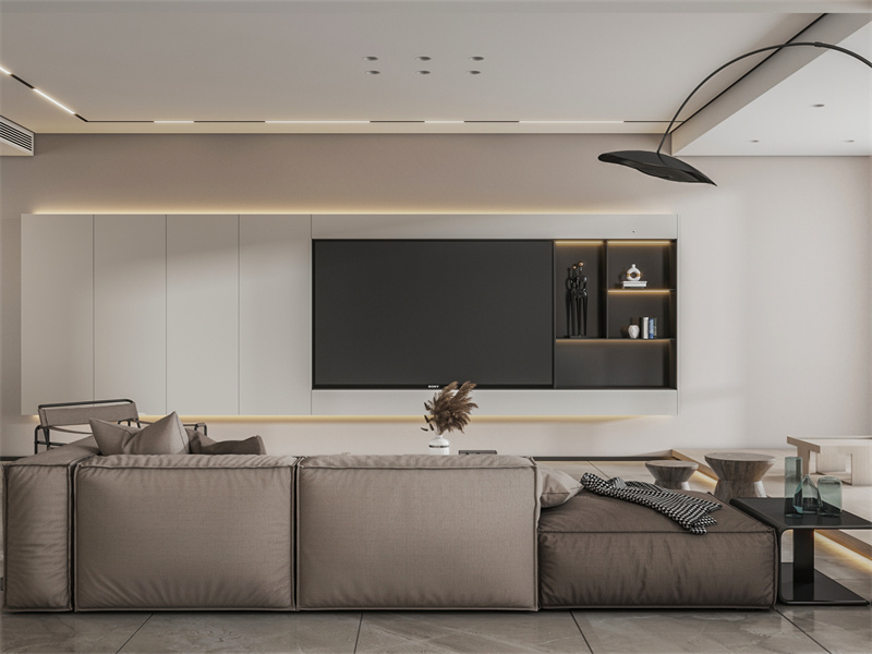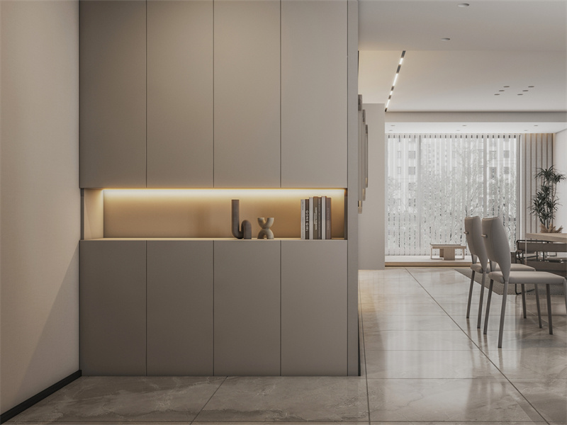 过渡收纳区,以上下同色系哑光柜面为基底,柜体做上下封闭+中部开放布局,开放区用极简摆件点睛,避免单调。暗藏灯带强化展示层次,地面通铺石纹砖通透统一。