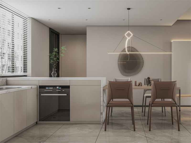 以低饱和暖棕为基调,靠材质衔接实现功能融合,一体化设计,石纹台面与哑光柜面呼应,餐椅选棕褐皮质款,平衡空间质感,透出轻暖精致的用餐氛围。