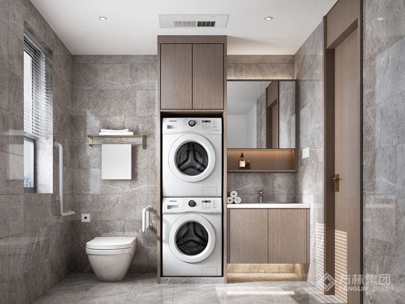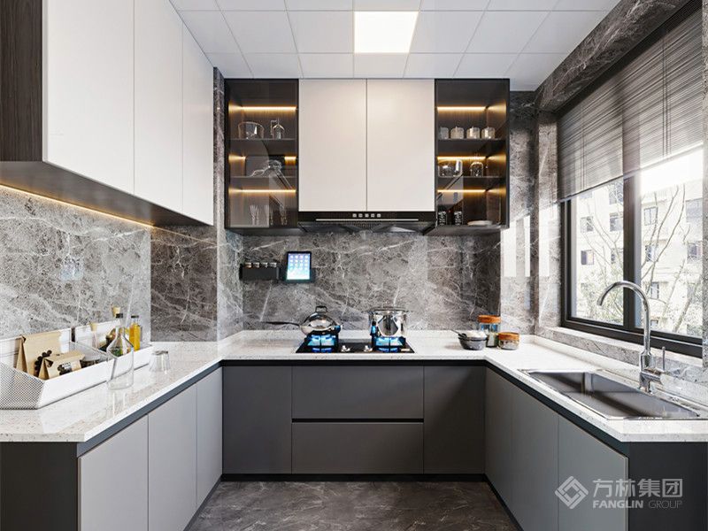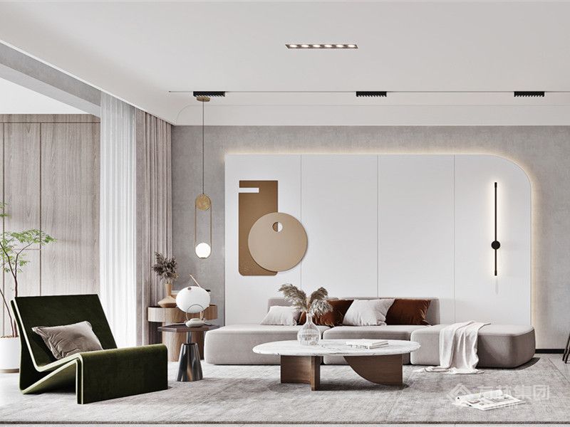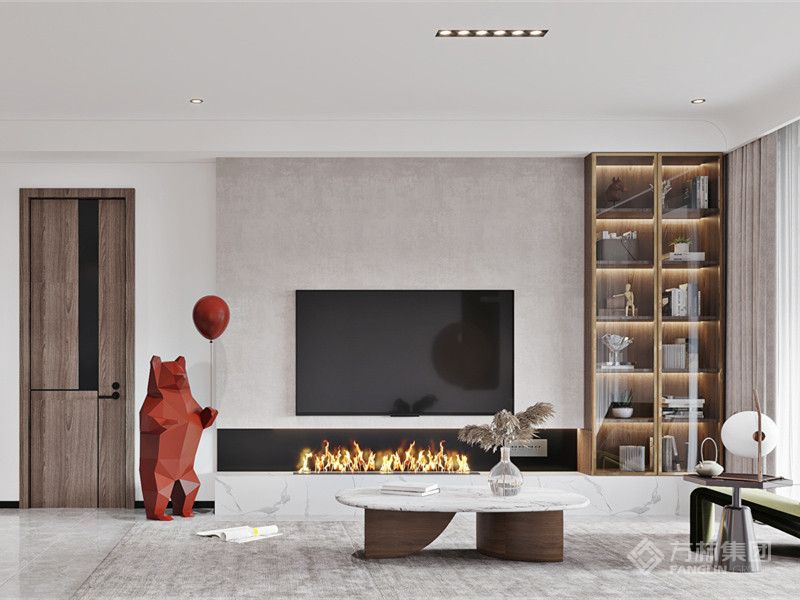 以大理石、木肌理、金属等组合强化轻奢质感,一体化布局拉通区域联动,定制柜体兼顾收纳与展示。