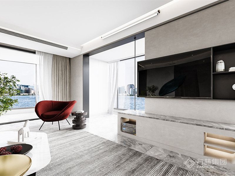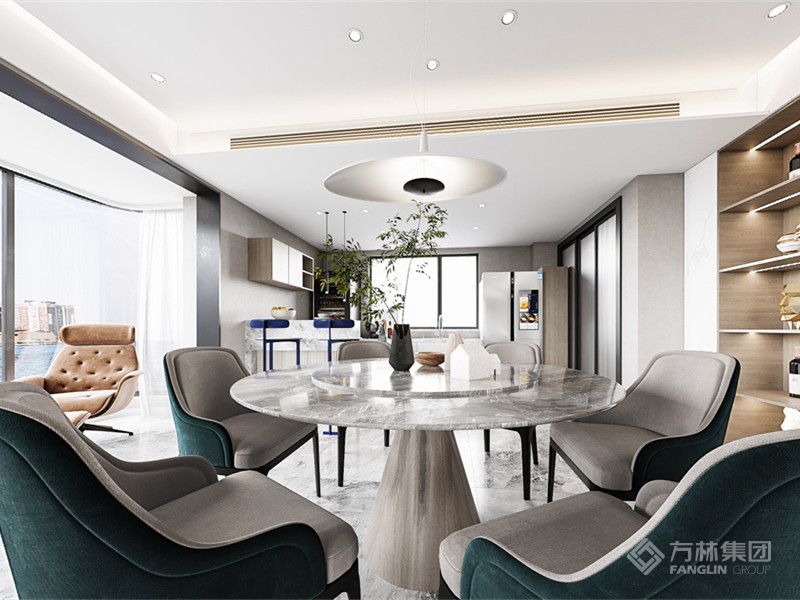 以大理石、木肌理、金属等组合强化轻奢质感,一体化布局拉通区域联动,定制柜体兼顾收纳与展示。
