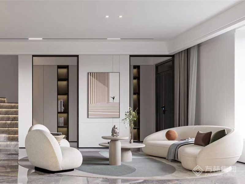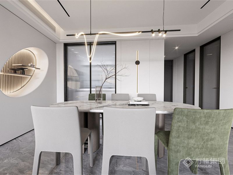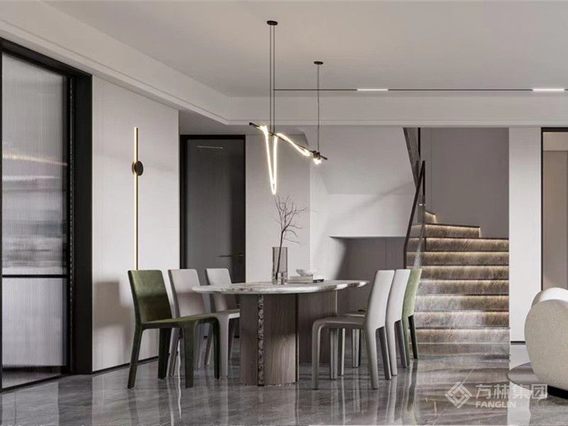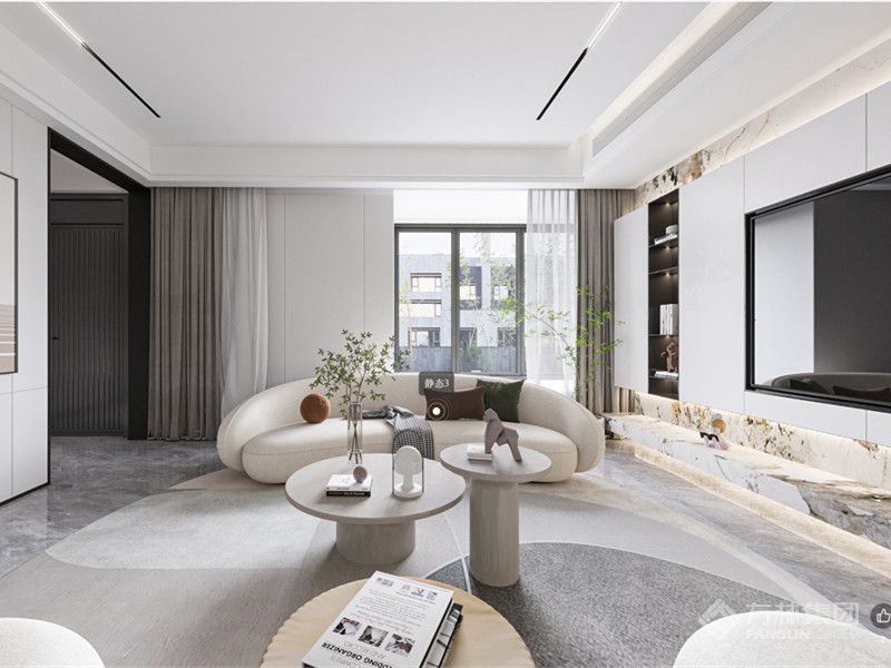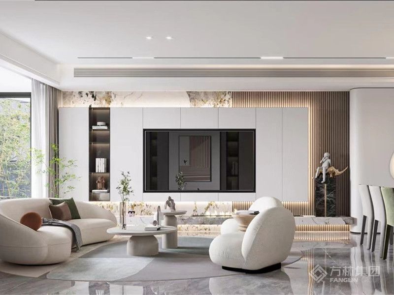 以大理石、木肌理、金属等组合强化轻奢质感,一体化布局拉通区域联动,定制柜体兼顾收纳与展示。