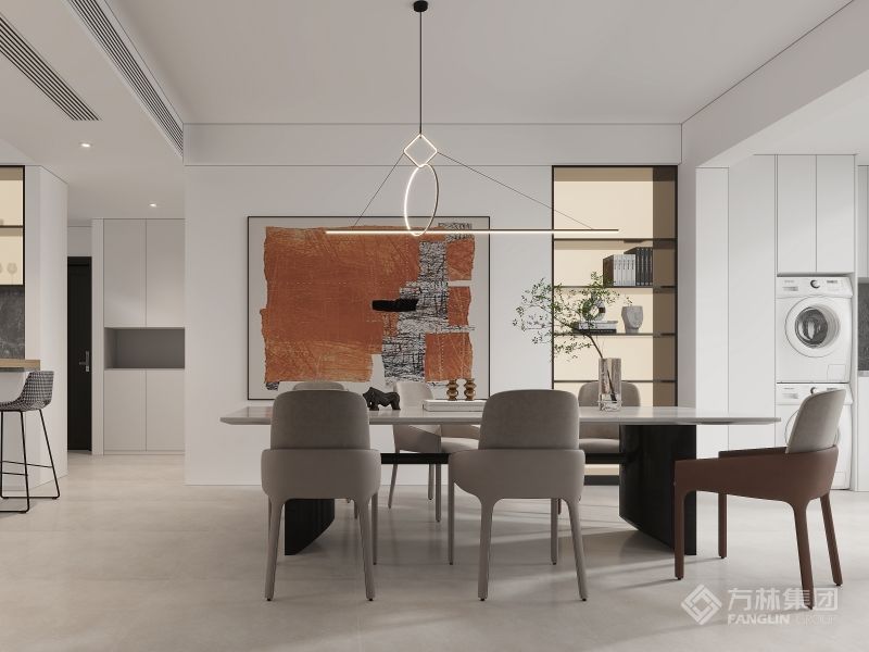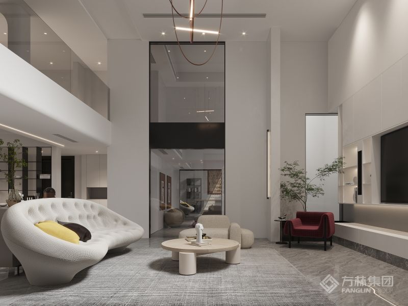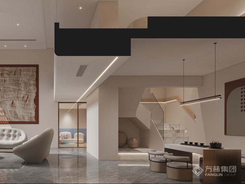 以大理石、木肌理、金属等组合强化轻奢质感,一体化布局拉通区域联动,定制柜体兼顾收纳与展示。