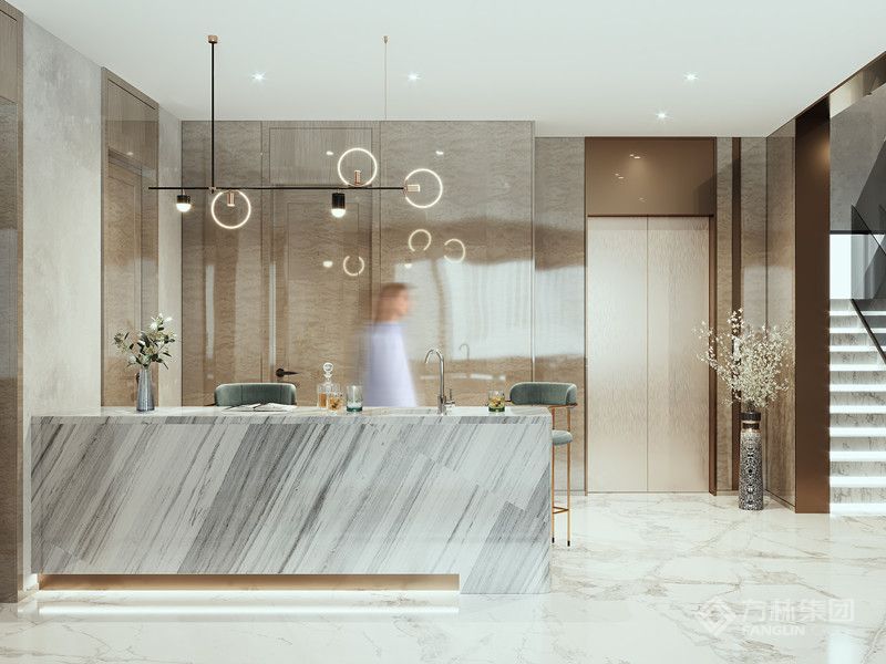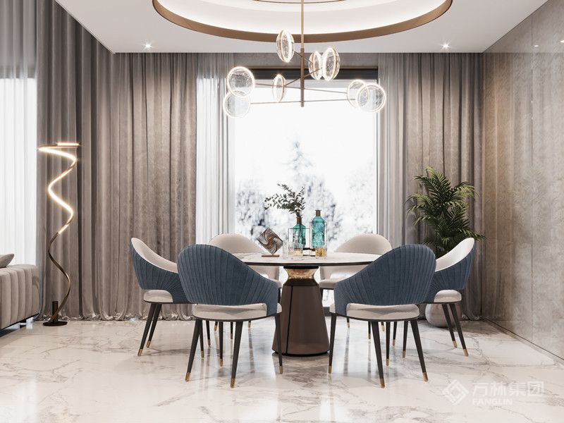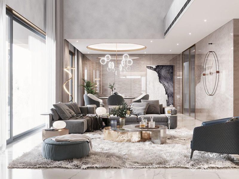 开放式布局拉通区域联动,细节上,造型灯具、软装肌理与景观采光的适配,强化生活质感。