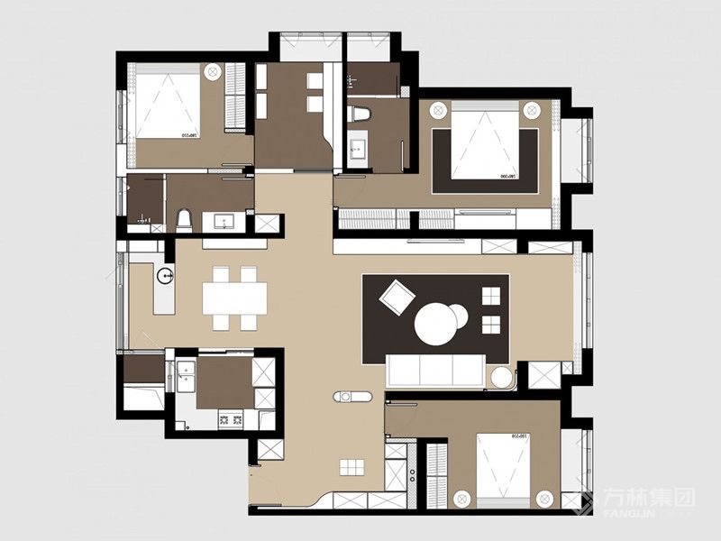 结合客户的大概需求,把不规则的迷宫户型改善一下,经初步沟通,需要四房,三卫只保留两卫,厨房需要扩大,双阳台只有一个做生活阳台,还有一个做休闲阳台,增加客餐厅的通透感。客餐厅做中央空调和无主灯设计,卧室均做常规设计即可。