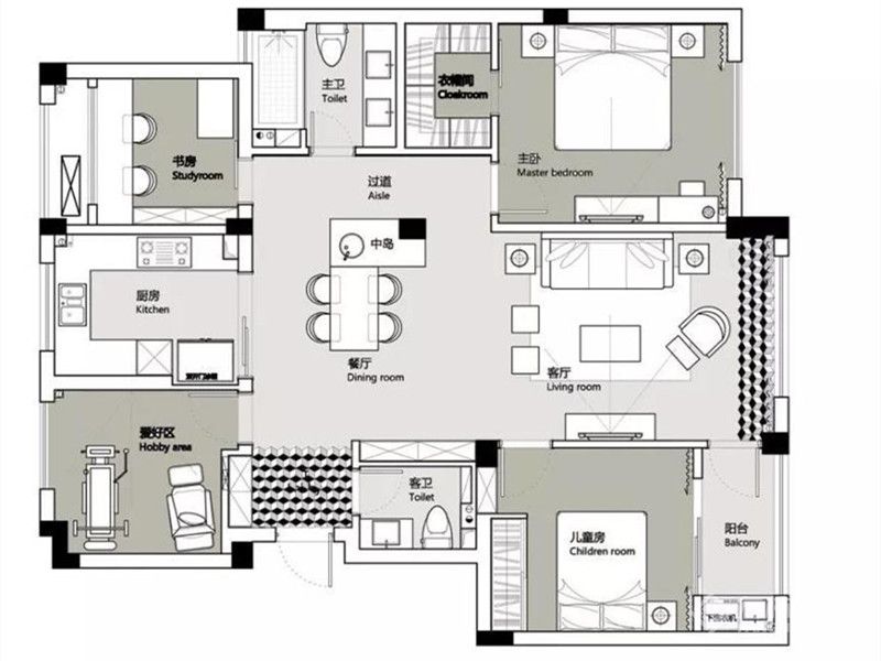 结合客户的大概需求,把不规则的迷宫户型改善一下,经初步沟通,需要四房,三卫只保留两卫,厨房需要扩大,双阳台只有一个做生活阳台,还有一个做休闲阳台,增加客餐厅的通透感。客餐厅做中央空调和无主灯设计,卧室均做常规设计即可。