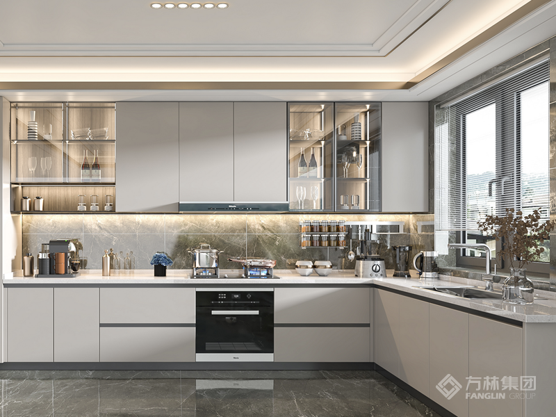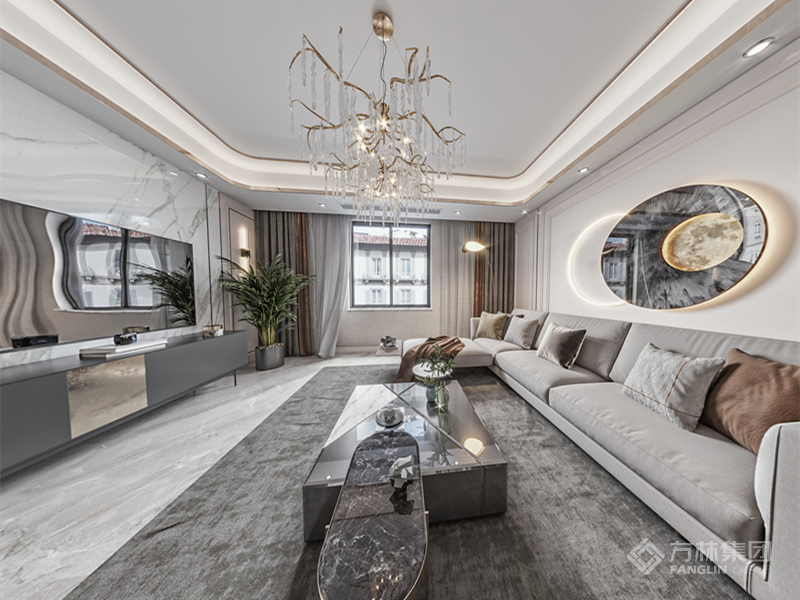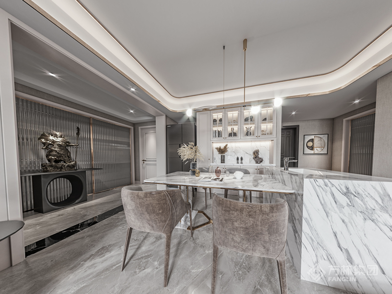 以大理石、木肌理、金属等组合强化轻奢质感,一体化布局拉通区域联动,定制柜体兼顾收纳与展示。
