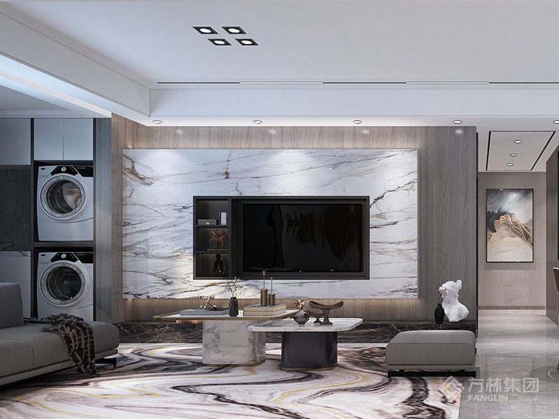 起居室完整表达整体的设计风格,整体简洁明净,现代设计手法处理空间尺度,低饱和度色系,将当代人的审美情趣融合在这座私宅中。
