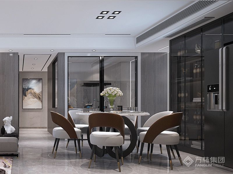 客餐厅连接为一体,空间通透,视野开阔。顶面灯带与背景墙灯带的处理手法,审美与功能兼备。沙发后背景装饰,与纵向线条碰撞,如影如画。